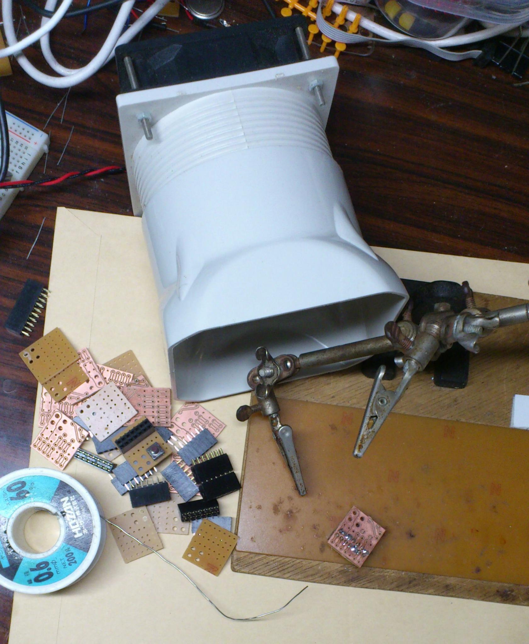 勤務校ロボット部の生徒さんが廃棄パソコンのファンとCPUの熱気をケース外に導くダクトを利用して作っていたので真似した。