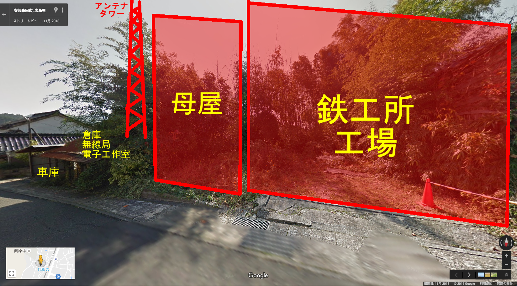 工場と母屋は解体され敷地は竹藪に飲まれつつある。車庫と倉庫(兼:アマチュア無線局,電子工作室他)がかろうじて残っている。